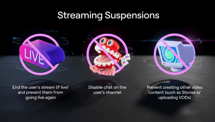 В новой системе нарушения, допущенные во время прямой трансляции, приведут к блокировке аккаунта в части возможности стримить и отключению чата на его канале. Однако пользователь сохранит возможность смотреть трансляции, оставаться авторизованным, общаться на других каналах и пользоваться панелью управления. При блокировках за нарушения в чате, пользователи смогут продолжить вести трансляции и просматривать контент других стримеров, однако потеряют возможность участвовать в чужих чатах и заблокированы для общения вне своего канала.